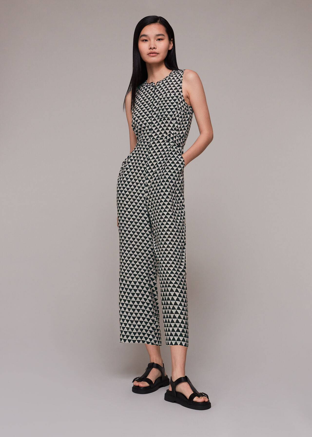 This garment is a sleeveless jumpsuit made from breathable linen fabric, featuring a streamlined fit with a full-length design. It has a fully lined bodice, side pockets, a concealed back zip, and a centre back keyhole, offering a combination of comfort and style suitable for warm weather.