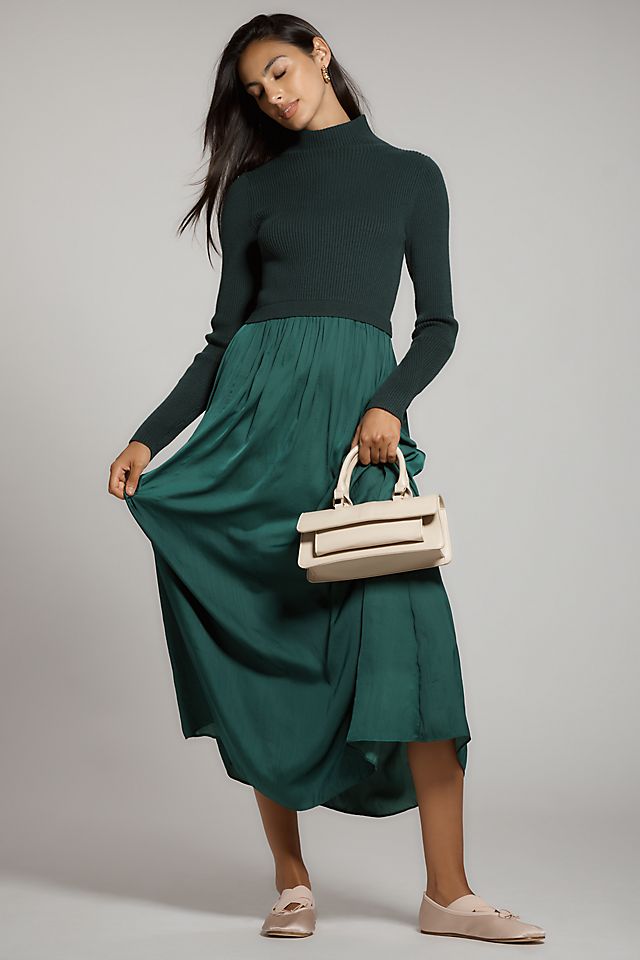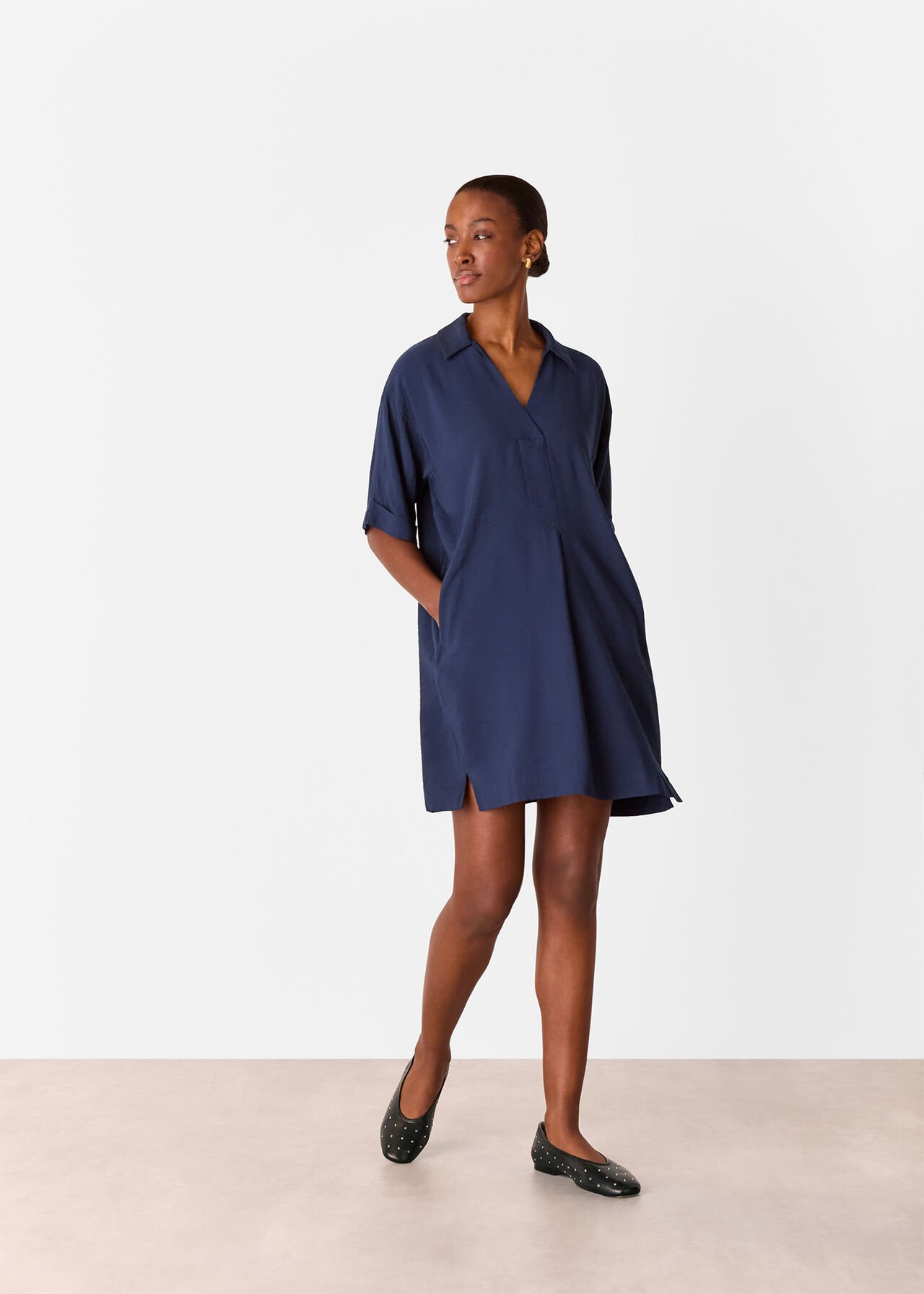 This dress is crafted from natural, breathable linen and features blouson sleeves with statement smocking across the shoulders. It is designed with a straight fit, side seam pockets, and a detachable self-fabric belt, making it suitable for elevating everyday outfits. The length finishes at the low calf, and it is unlined, offering a comfortable and stylish option.